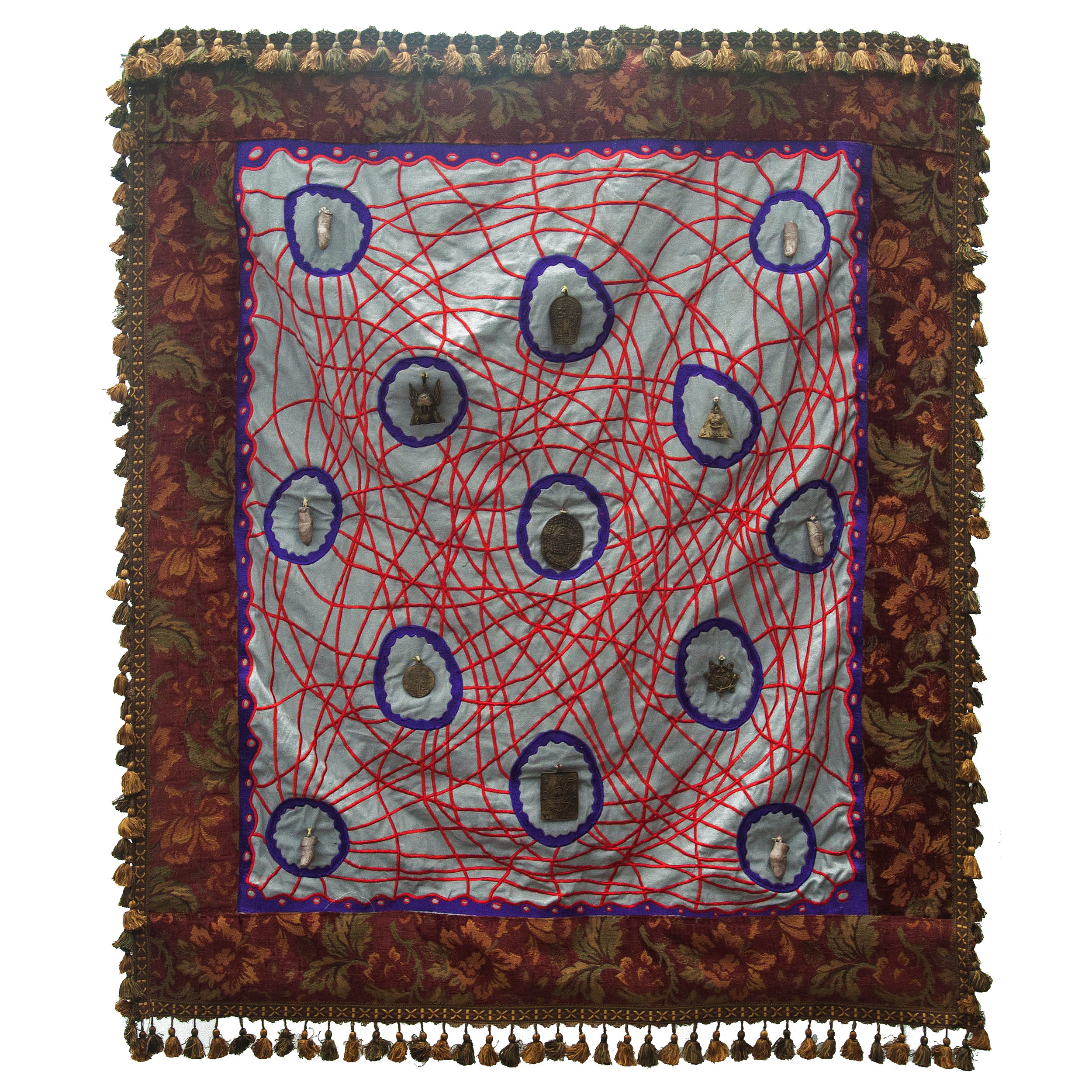 "Dominator II", 2022, Objects and embroidery on fabric (collaboration with Henricus), approx. 45 x 50 in (114.3 x 127 cm)