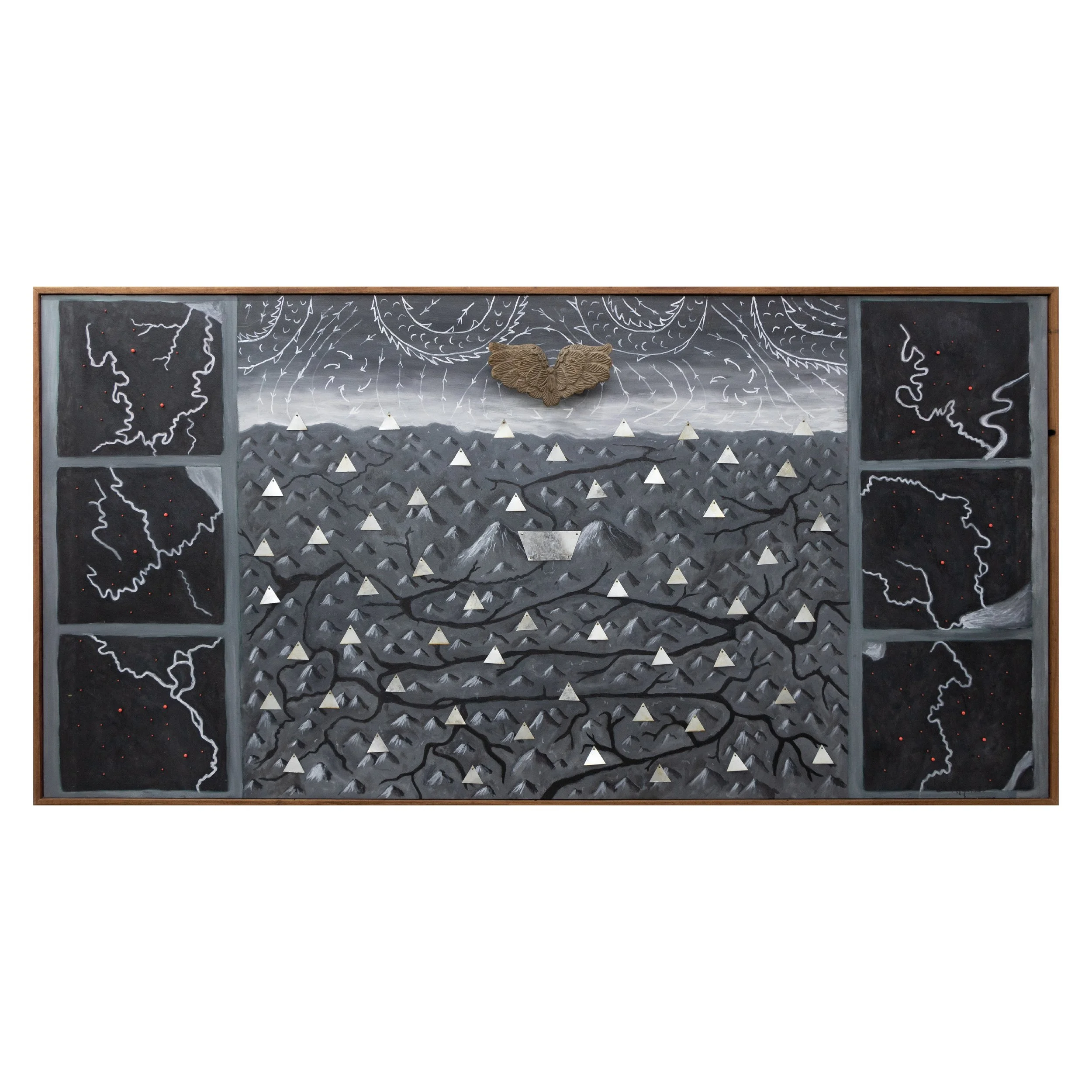 "Dam Nation", 2023, Plastic pins, metal sheets, woodwork and oil on canvas panel, framed with reclaimed wood, 49 3/4 x 98 in (126.5 x 249 cm)