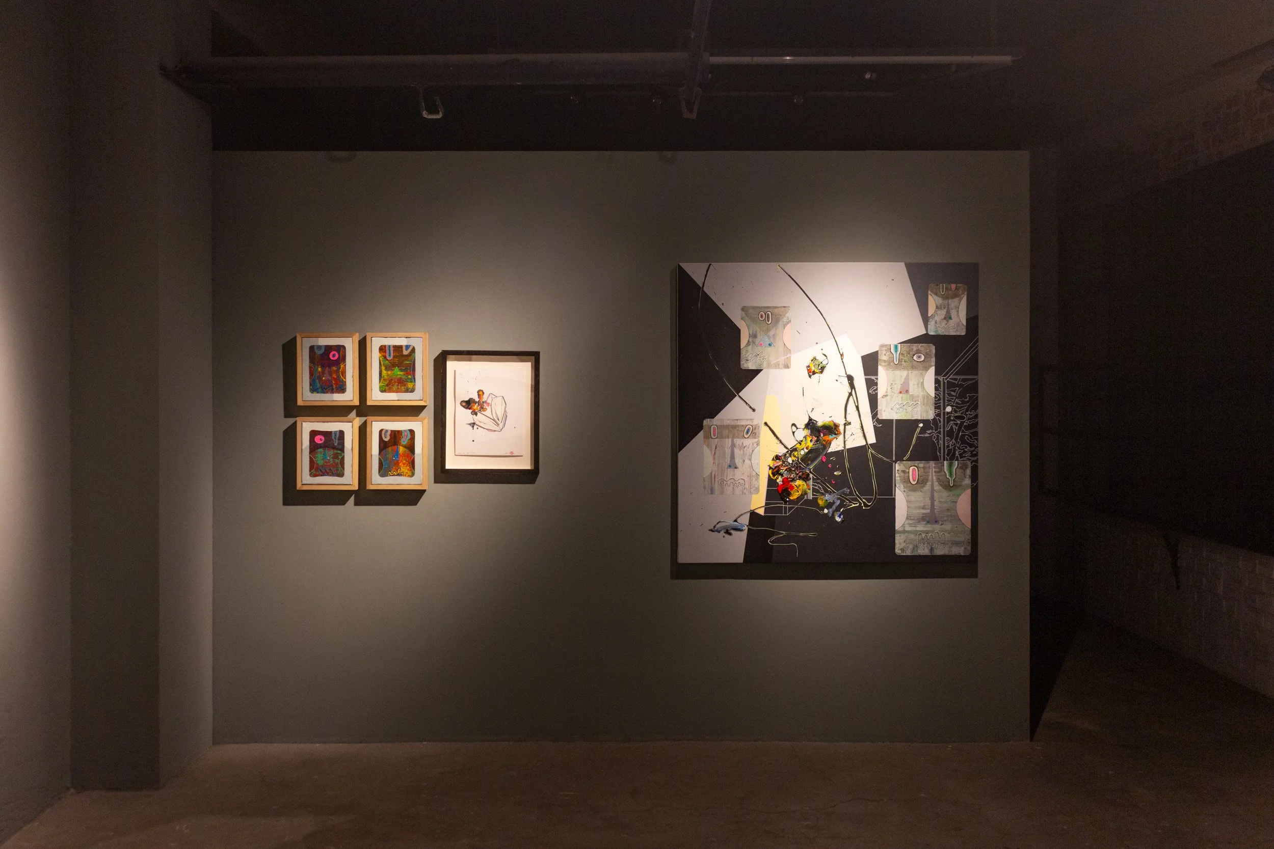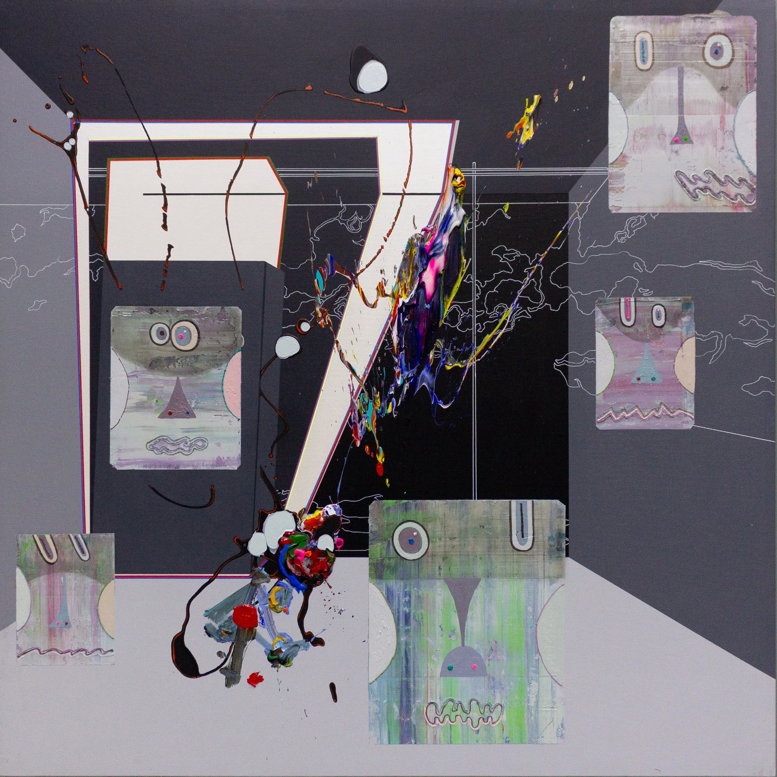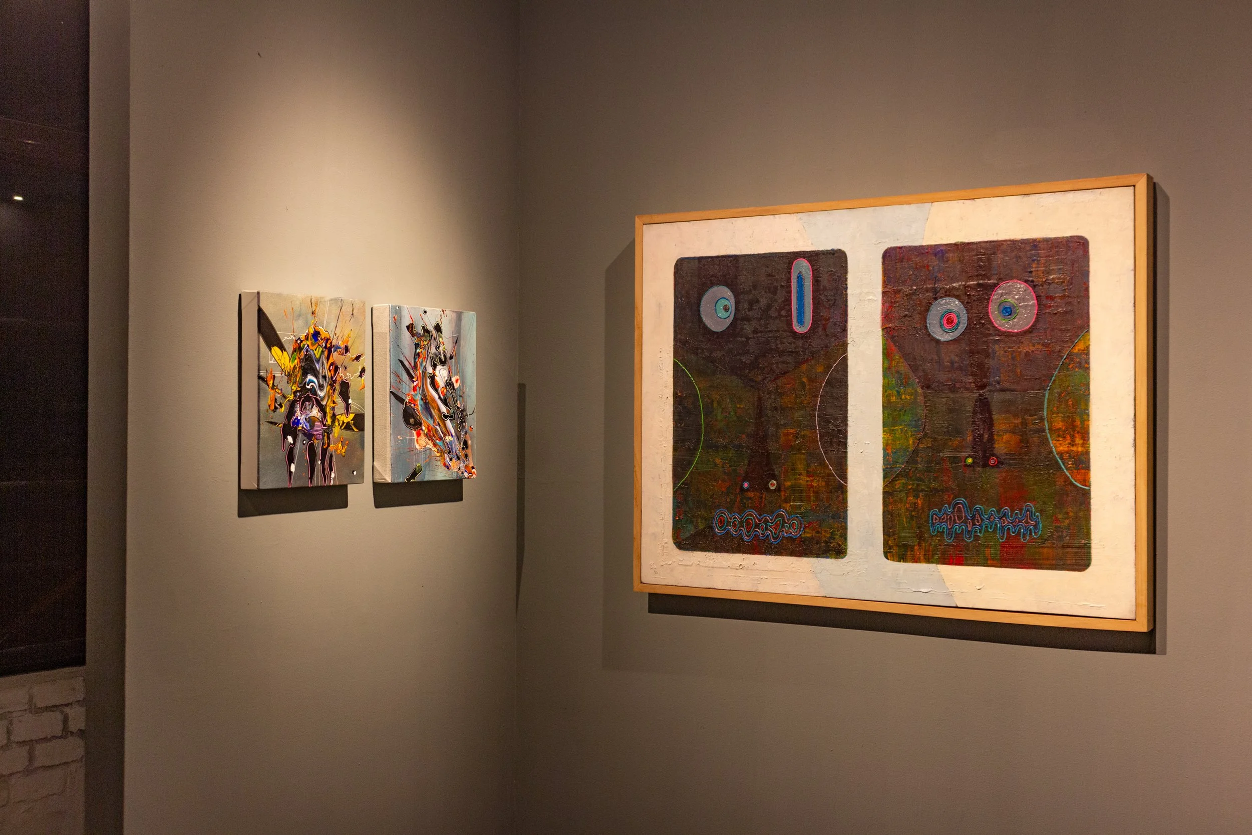 Chun and Lorenzana’s joint works, CCxLL, riff on one another’s exploratory painting strategies. Chun uses his characteristic masking method to create Baconian demarcations of space, with bold angular bands adding depth against dark backgrounds. The bold angular bands imbue a sense of depth against the black backgrounds. Subtly rendered lines evoke landscapes, endowing a meta-like quality to the composition and engaging with the legacy and reinterpretation of tradition. Lorenzana’s signature heads, scaled down and scattered throughout the composition, rework the painterly surface in an almost disorienting manner. The visages’ undulating pattern, rendered in vivid colours, juxtapose the composition’s otherwise dark aura. In these co-authored works, Chun and Lorenzana push the boundaries of painting as a medium, creating pieces that are simultaneously elegant, intricate, and rich in meaning.