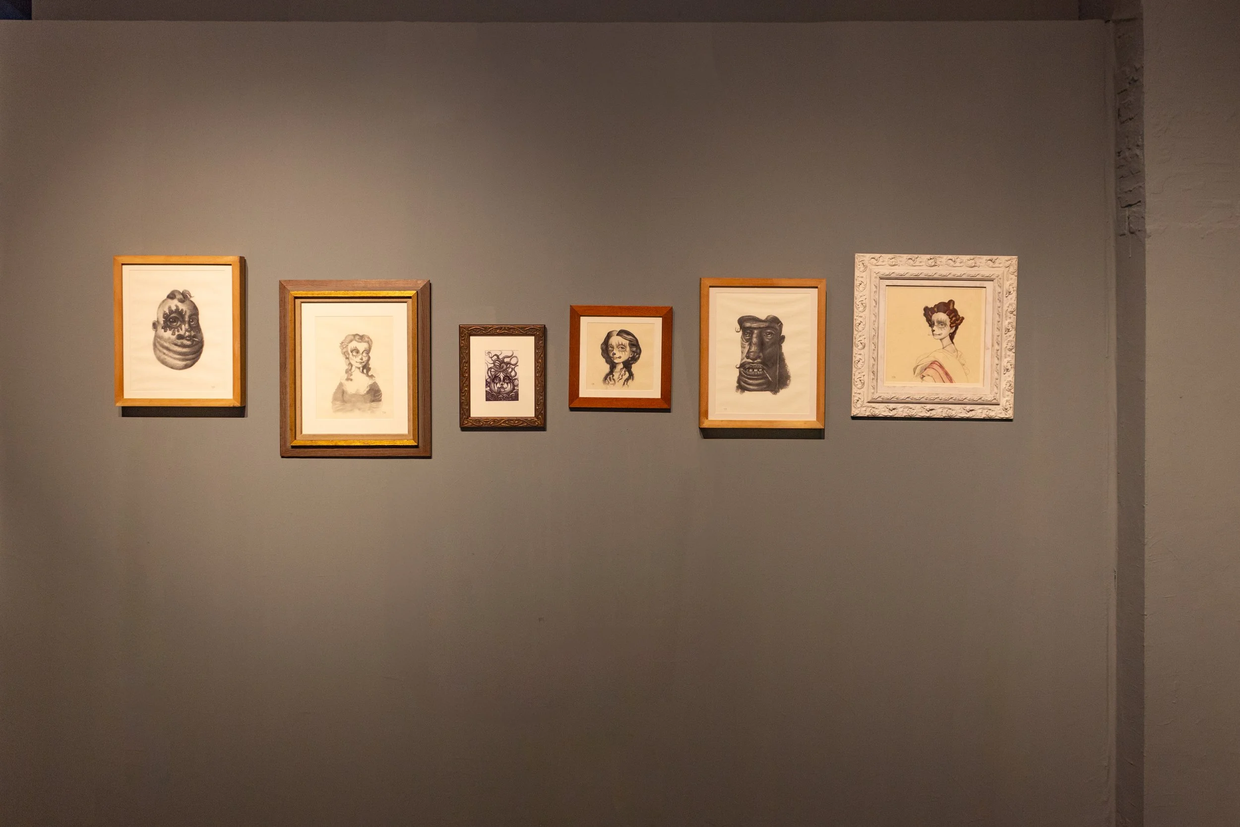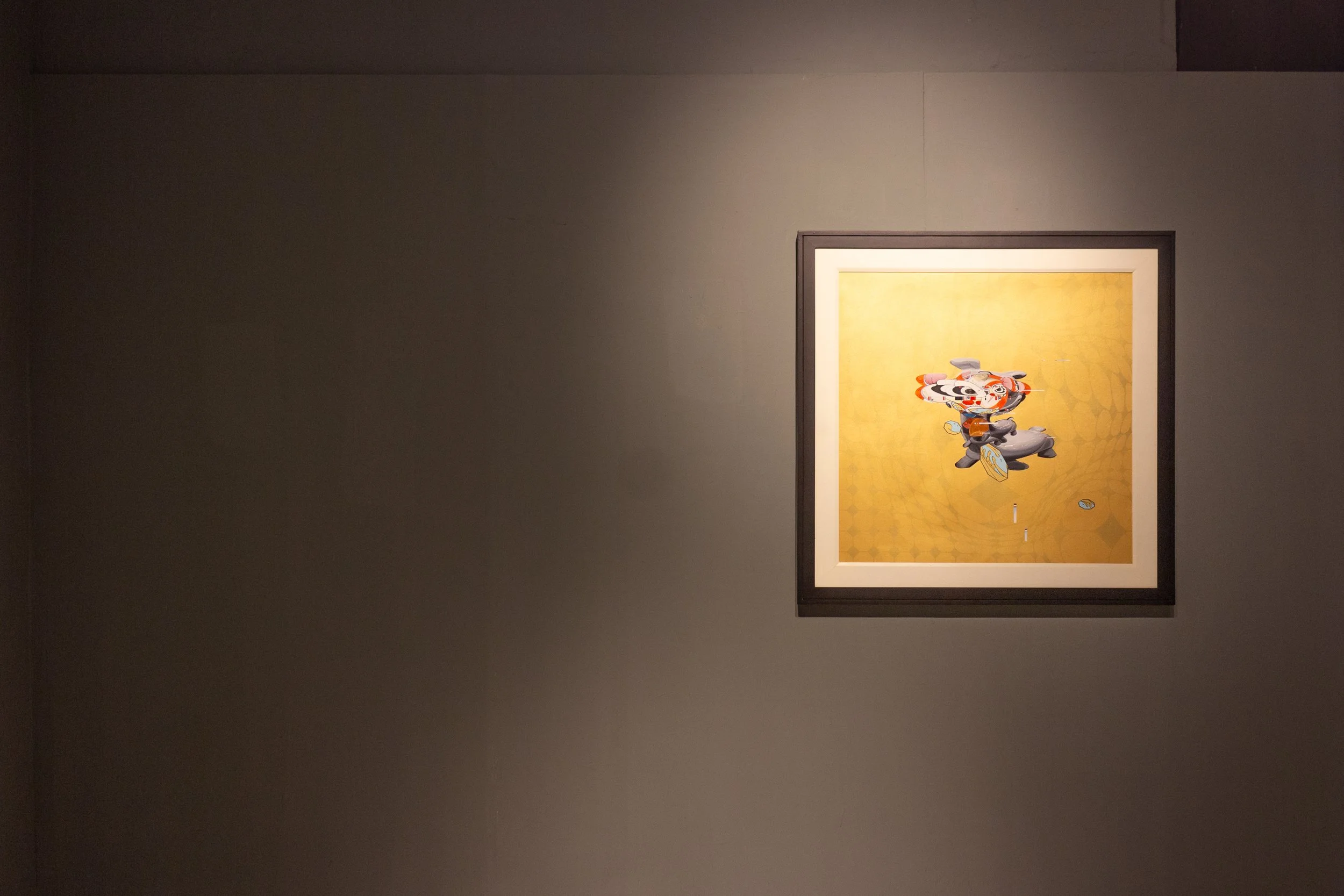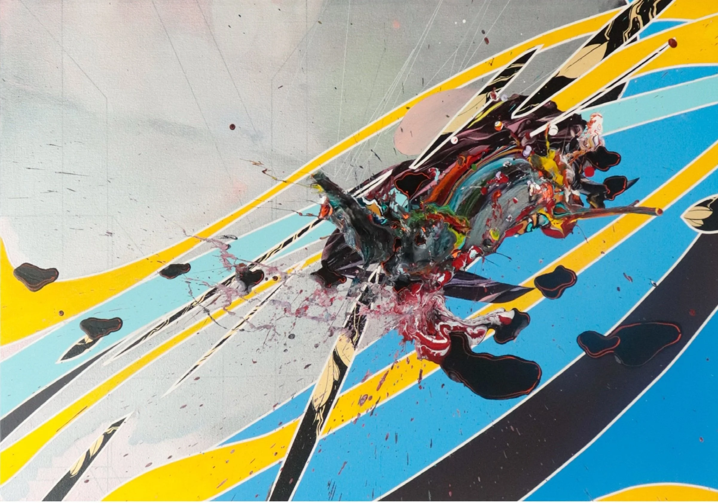 Chun and Lorenzana’s joint works, CCxLL, riff on one another’s exploratory painting strategies. Chun uses his characteristic masking method to create Baconian demarcations of space, with bold angular bands adding depth against dark backgrounds. The bold angular bands imbue a sense of depth against the black backgrounds. Subtly rendered lines evoke landscapes, endowing a meta-like quality to the composition and engaging with the legacy and reinterpretation of tradition. Lorenzana’s signature heads, scaled down and scattered throughout the composition, rework the painterly surface in an almost disorienting manner. The visages’ undulating pattern, rendered in vivid colours, juxtapose the composition’s otherwise dark aura. In these co-authored works, Chun and Lorenzana push the boundaries of painting as a medium, creating pieces that are simultaneously elegant, intricate, and rich in meaning.