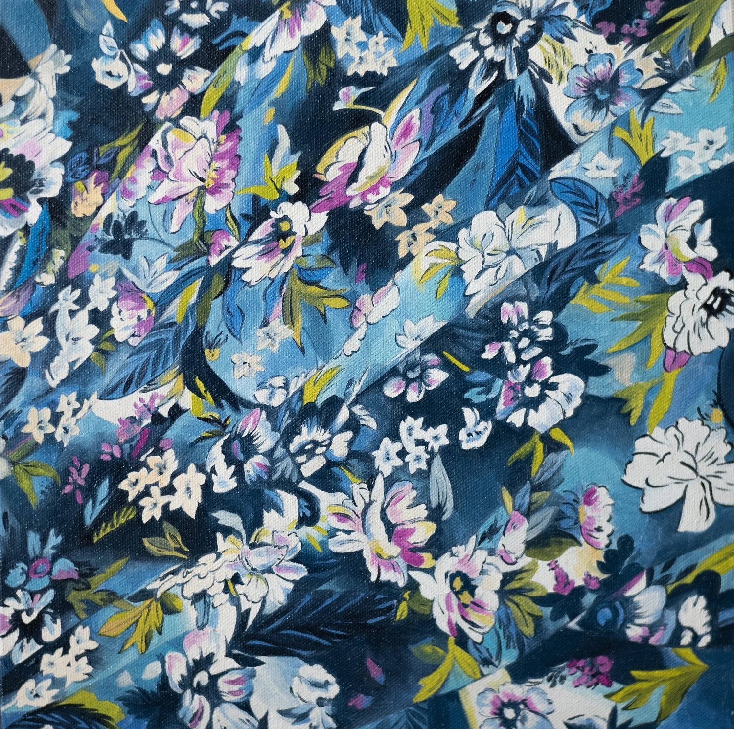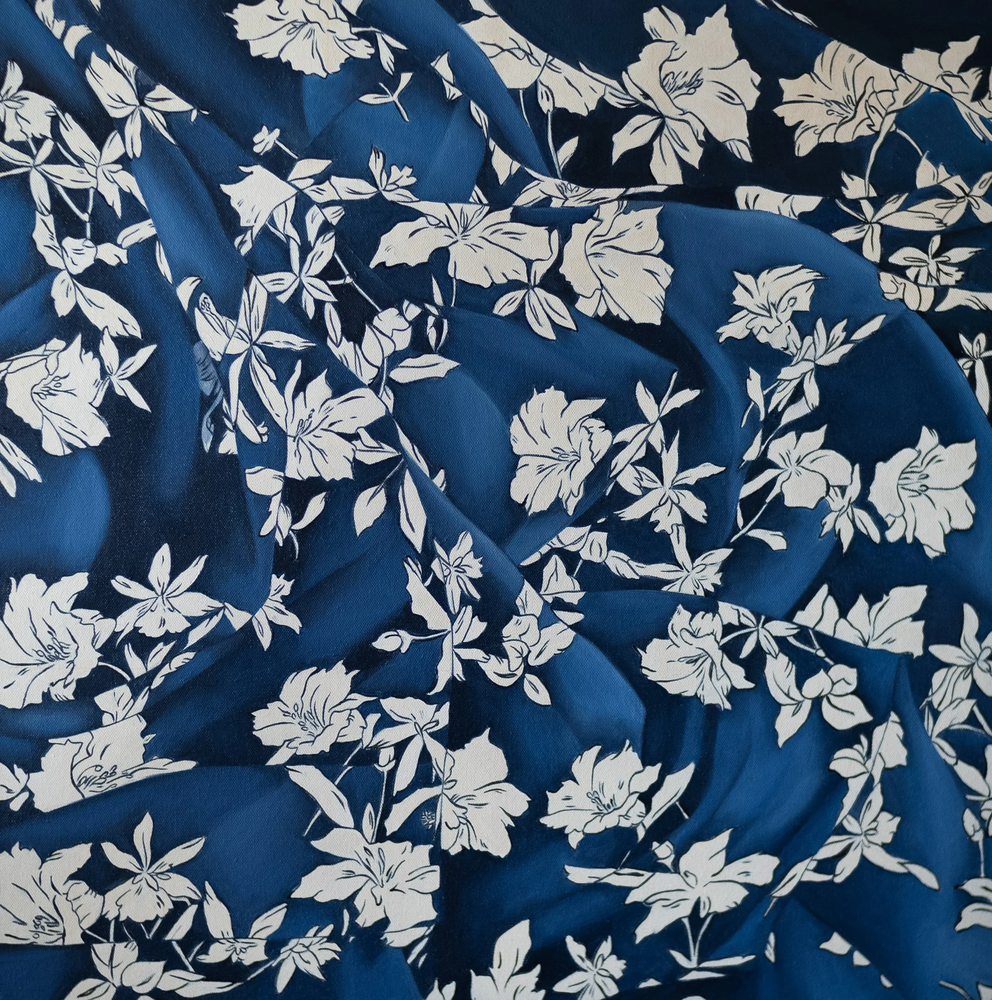 The shades of blue and the floral images symbolize the longing and nostalgia for spring to happen. However, the repetitive patterns of blooms that emerge from the creases and folds would produce the illusion of being caught in a labyrinth. Like an M. C. Escher painting, De Leon’s paintings would appear to diminish our perspectives on time and the stasis of growth.