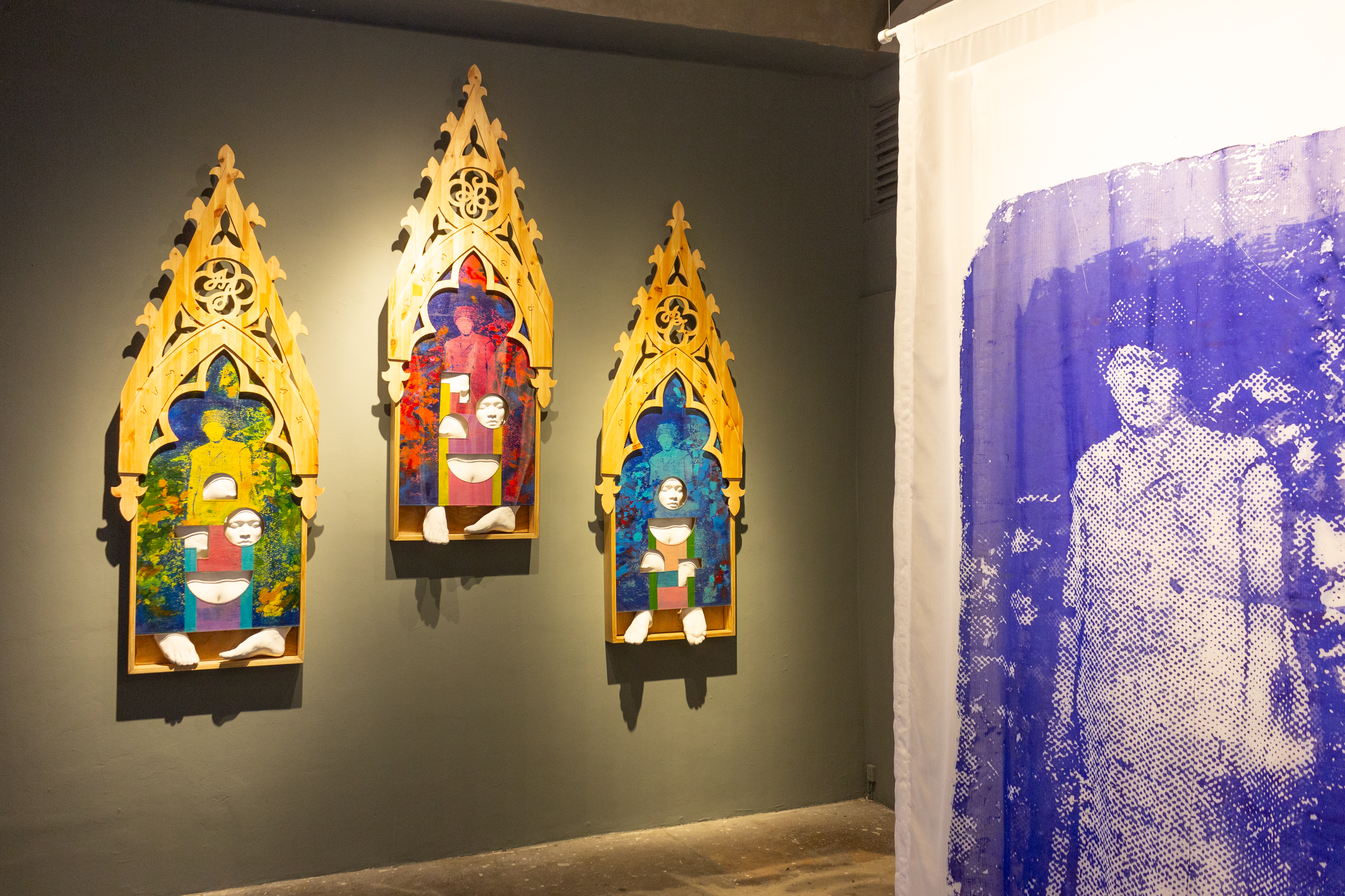 Jore's assemblages, paintings, and textile works propose the idea of queer wakefulness as a precondition to queer justice--wherein its history is recognised and honored, and its varied forms and complexities are embraced. There are altars of remembrances recalling these fragmented recollections. Boldly painted contemporary queer figures stand alongside images of a revered queer figure printed on fabric. Perhaps it is an attempt to suggest a transitory period of understanding. Lifted from Lawrence Ypil's poem Bless the Beast, the exhibition's title fittingly examines the precarious conditions of the 'othered' and the 'altered'. With its intent leaning towards queer liberation and inclusivity, the exhibition contributes to the discourse of the ongoing process of acceptance through the many bewildering ways of presentation.