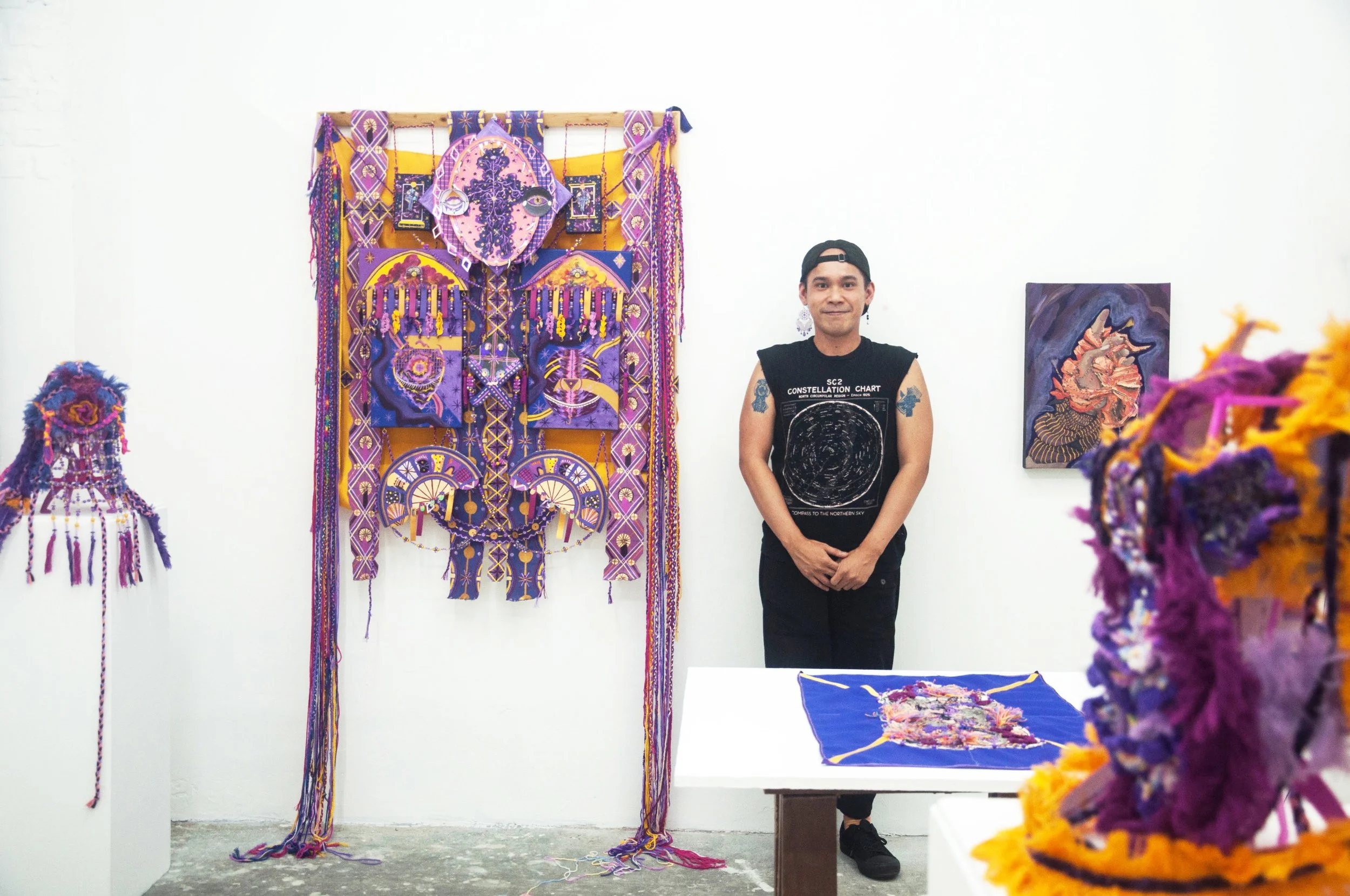 Presenting a series of multimedia works, which begins in a poem, Denver Garza’s “Hole in the Shape of the Body” explores the transformation of being and the elements that recast the body and spirit after a tumultuous period. Here, Garza uses poetry, painting, assemblage, and sculpture in assessing these shifts and transitions. Thus, the artist points to rituals such as the Traslación, an annual procession associated with the feast of the Black Nazarene, as an influence in understanding the process of renewal. While Garza does not directly take from the religious and liturgical association of the ritual, the artist observes its importance as a phenomenon in the symbolic awakening of the body and spirit. The color purple/violet heavily dominates the exhibition and represents the final verses of the artist’s poem: