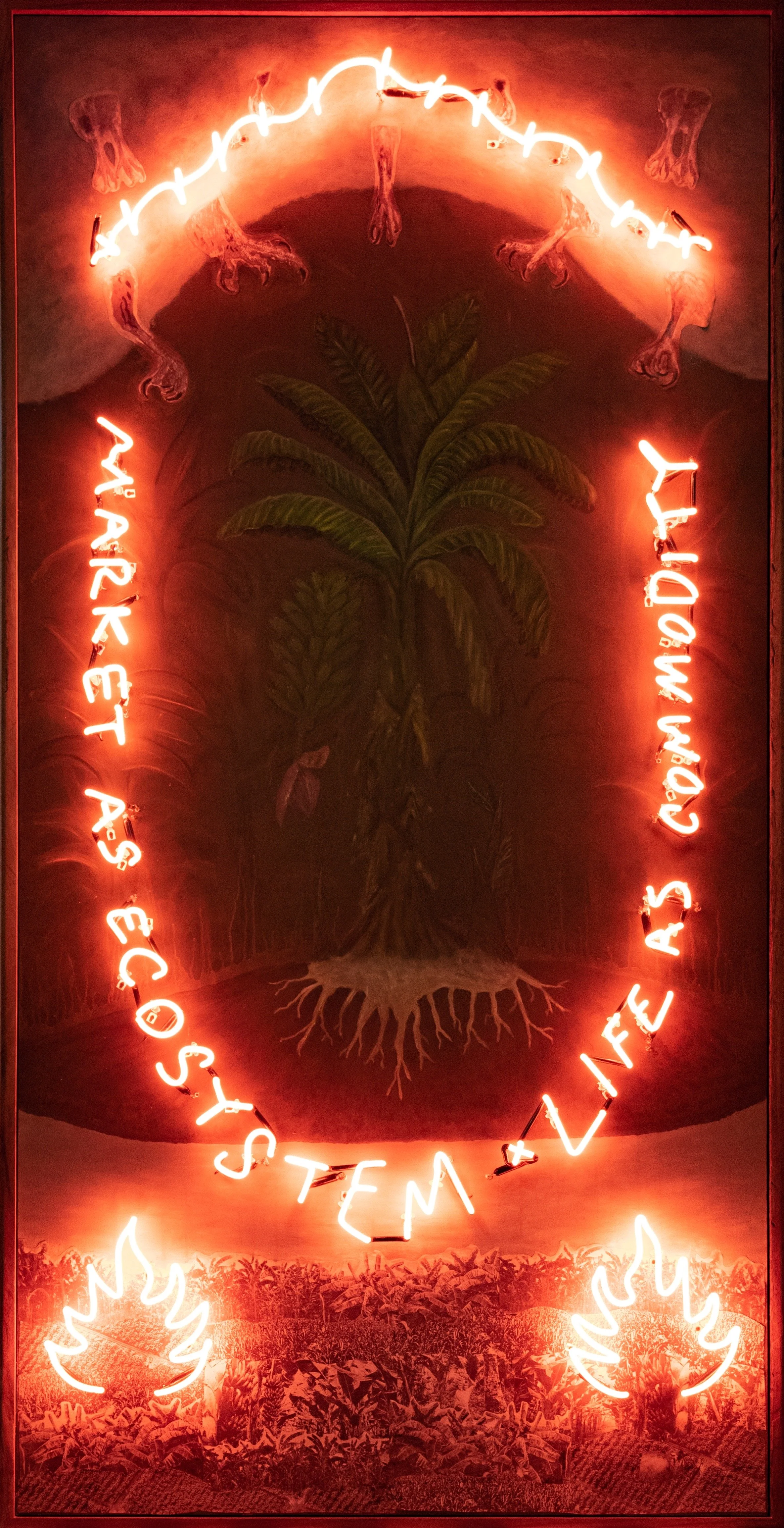 AP: When operating under plantation logics, everything about the natural world must be financialized. Living beings–birds, insects, plants, mollusks, and fungi–that naturally occupy green spaces but are not the cash crop in question, or do not contribute directly to its nutrition, are labeled as “weeds” and “pests.” Herbicides, insecticides, fungicides, and nematicides– all “life-killers” by etymological definition--eradicate these unwanted life forms, deemed valueless, in the name of “clean culture methods” and “modern scientific management.” The result is a neoliberal landscape that may have an impressively green canopy up above, but whose soil down below is a chalky light brown. On clean culture plantations, thick banana pseudostems stick out of the ground like lamp posts on a concrete street. Familiar life forms, like grasses, snails, worms, and bugs, are nowhere to be seen. Stray dogs and native chicken from nearby households stay away, likely attuned to the chemical haze that envelops the grounds. In the nighttime, the plantation is eerily silent, with not a single bird to be heard. The ironic thing is that several people will look upon this landscape and call it “beautiful.” Visitors to Mindanao, often coming from the Philippines’ urban centers, see the undisturbed canopy of green, and the unending, orderly rows of plants, and mistake it for “nature.” This modernist aesthetic, which sees beauty in a landscape of extreme and forced uniformity, are manifestations of neoliberalism’s inroads into the mind.
