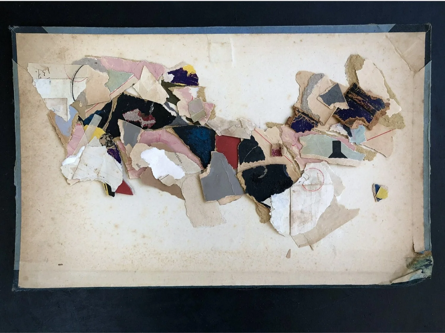 Certain collages are assembled in grids and patterns, in a pursuit of order, or the illusion of it, over things that cannot be fully controlled. Urmaza obsesses over pandemic data tracking and studies, and desires for a predictability in the forecasts. Her titles, such as “Surge” and Abatement” and “Islands and Borders”, refer to terms frequently used in news reports. A few collages resemble maps, as if creating a sense of place and perspective. While she tries to make all the pieces fit through persistent examination and recalibration, the final work always turns out differently from her original idea. She ultimately realized the gift of serendipity, “that I should always leave room for the unknown, the inexplicable and the abstract, with the hope that I end up with something that merges accident and intention.”